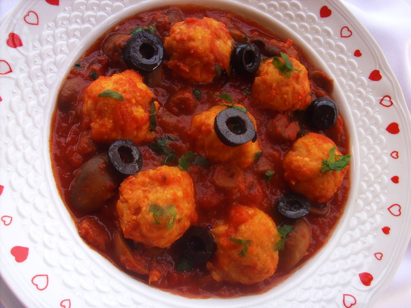 Ceapa se rade pe razatoarea fina.Usturoiul se piseaza.Ciupercile se taie feliute.Intr-o tigaie se incinge uleiul si se inabusa ceapa,usturoiul si 100 ml.suc de rosii.Se adauga apoi rosiile taiate cubulete,restul de suc de rosii,sare,zaharul si ciupercile,si se lasa la fiert la foc mic 10 minute.Se adauga apoi chiftelutele si se mai lasa cateva clocote.